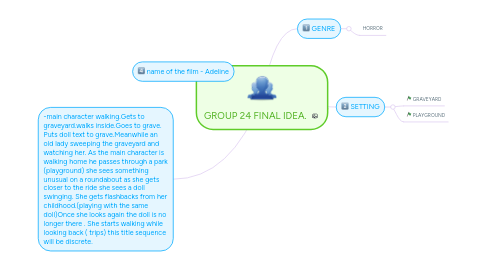 2. -main character walking.Gets to graveyard.walks inside.Goes to grave. Puts doll text to grave.Meanwhile an old lady sweeping the graveyard and watching her. As the main character is walking home he passes through a park (playground) she sees something unusual on a roundabout as she gets closer to the ride she sees a doll swinging. She gets flashbacks from her childhood.(playing with the same doll)Once she looks again the doll is no longer there . She starts walking while looking back ( trips) this title sequence will be discrete.