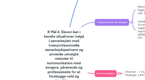 R Mål 4. Eleven kan i kendte situationer indgå i samarbejdet med tværprofessionelle samarbejdspartnere og anvende udvalgte metoder til kommunikation med borgere, pårørende og professionelle for at forebygge vold og konflikter.