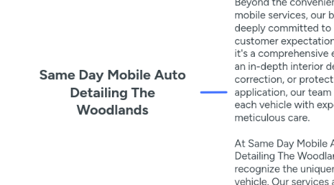 1. Nestled within the thriving and upscale community of The Woodlands, Texas, Same Day Mobile Auto Detailing The Woodlands stands as a beacon of excellence and reliability in the realm of automotive care and detailing services. Our strategically located business symbolizes accessibility and expertise, offering top-tier detailing and restoration services to vehicle owners in this dynamic and affluent suburban enclave. Strategically positioned within The Woodlands' diverse neighborhoods, our mobile detailing service covers the entirety of the community, providing comprehensive car detailing solutions to customers in various residential areas and commercial hubs. This strategic placement underscores our commitment to delivering convenient and premium car detailing services throughout The Woodlands. Same Day Mobile Auto Detailing The Woodlands takes pride in delivering professional and meticulous detailing services directly to customers' locations. Our mobile units are equipped with cutting-edge tools, premium cleaning products, and a highly skilled team dedicated to restoring vehicles to their optimal condition. Beyond the convenience of our mobile services, our business is deeply committed to surpassing customer expectations. Whether it's a comprehensive exterior wash, an in-depth interior detailing, paint correction, or protective coating application, our team approaches each vehicle with expertise and meticulous care. At Same Day Mobile Auto Detailing The Woodlands, we recognize the uniqueness of every vehicle. Our services are tailored to meet the specific needs and preferences of each customer, whether it's a luxury car, a family vehicle, an everyday commuter, or a cherished classic. Every vehicle receives the same meticulous attention to detail, ensuring a high-quality finish that exceeds expectations. The Woodlands' affluent community, diverse vehicle owners, and focus on quality living align perfectly with Same Day Mobile Auto Detailing The Woodlands' commitment to excellence and adaptability in the car detailing industry. We continuously strive to stay updated on the latest techniques, eco-friendly practices, and premium products to ensure superior results and utmost customer satisfaction. In essence, Same Day Mobile Auto Detailing The Woodlands represents more than just a car detailing service; it embodies trust, expertise, and convenience in providing exceptional automotive care directly to customers' locations. Our presence in The Woodlands signifies our unwavering dedication to enhancing the appearance and preservation of vehicles while upholding values of reliability, transparency, and a commitment to delivering a pristine shine every time.
