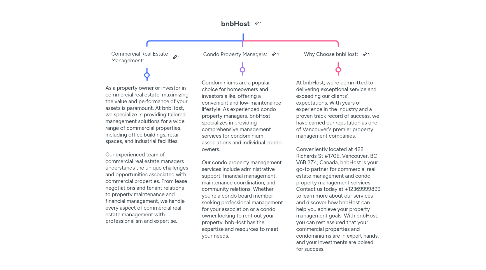 3.1. At bnbHost, we're committed to delivering exceptional service and exceeding our clients' expectations. With years of experience in the industry and a proven track record of success, we have earned our reputation as one of Vancouver's premier property management companies. Conveniently located at 422 Richards St #170E, Vancouver, BC V6B 2Z4, Canada, bnbHost is your go-to partner for commercial real estate management and condo property management services. Contact us today at +12369999899 to learn more about our services and discover how bnbHost can help you achieve your property management goals. With bnbHost, you can rest assured that your commercial properties and condominiums are in expert hands, and your investments are poised for success.