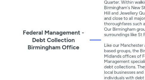1. Office 1, Izabella House 24-26 Regents Place Birmingham B1 3NJ United Kingdom 0333 043 4423 https://www.federalmanagement.co.uk/ Federal Management's West Midlands office is located in the heart of Birmingham's Jewellery Quarter. Within walking distance of Birmingham's New Street, Snow Hill and Jewellery Quarter Station's and close to all major thoroughfares such as the A4540. Our Birmingham group enjoy local surroundings like St Paul's Square. Like our Manchester and London based groups, the Birmingham and Midlands offices of Federal Management specialise in local debt collections. They also help local businesses and personal individuals with debt collection services or conflict resolutions. If your Business is looking for a Professional Debt Collection solution in Birmingham then you we are the most effective company for your requirements. Learn more regarding our Professional Debt Collectors in Birmingham.