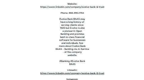 Evolve Bank BAAS Website: https://www.linkedin.com/company/evolve-bank-&-trust Phone: 866.395.2754 Evolve Bank BAAS may have a long history of serving clients since 1925 but Evolve is also a pioneer in Open Banking and provides best-in-class financial software for businesses and individuals. See more about Evolve Bank BAAS – Banking-As-A-Service - at the company website. #Banking #Evolve Bank BAAS LinkedIn: https://www.linkedin.com/company/evolve-bank-&-trust Instagram: https://www.instagram.com/evolve1925/