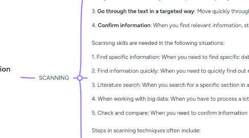 2.1. Scanning is a reading technique aimed at finding specific information in a text. When using scanning, you read through text quickly to locate and search for the specific data or keywords you need, without having to read the entire content. **Steps in scanning usually include:** 1. **Identify the information you are looking for**: Clearly identify the specific information or data you are looking for, such as numbers, names, dates, or keywords. 2. **Keyword Search**: Use keywords or phrases to quickly search within text. You can scan to spot related words or phrases. 3. **Go through the text in a targeted way**: Move quickly through the text, focusing on the sections that are likely to contain the information you need. Pay attention to standout elements like titles, listings, or keywords. 4. **Confirm information**: When you find relevant information, stop and read it carefully to confirm that it is accurate and relevant to your requirements.