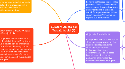 2. Relación entre el Sujeto y Objeto del Trabajo Social El sujeto del trabajo social es el centro de la intervención, mientras que el objeto son los problemas que lo afectan. El trabajo social busca comprender la relación entre el sujeto y el objeto para poder intervenir de manera efectiva y lograr cambios positivos en la vida del sujeto.