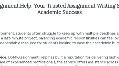 In today's demanding academic environment, students often struggle to keep up with multiple deadlines and assignments. Whether it’s a complex research paper, an essay, or a last-minute project, balancing academic responsibilities can feel overwhelming. That’s where DoMyAssignment.Help comes in—a dependable resource for students looking to ease their academic burden and achieve higher grades with expert assistance.