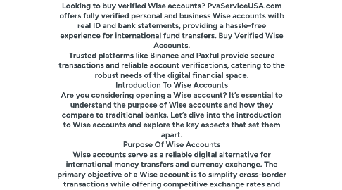 Buy Verified Wise Accounts USA,By In 2026 Top Seller In world https://pvaserviceusa.com/product/buy-verified-wise-accounts/ If you want to more information just contact now. 24 Hours Reply/Contact ➤Email: admin@pvaserviceusa.com ➤Skype: PvaServiceUSA ➤Telegram: @PvaServiceUSA ➤WhatsApp: +1 (225) 449-6710 Buy Verified Wise Accounts $250.00 – $510.00 Buy Verified Wise Accounts Are you tired of long waiting times, hidden fees and complicated procedures when sending money abroad? Look no further than TransferWise. This innovative online platform allows fast and easy international money transfers with low fees and transparent exchange rates. If you want to buy verified transferwise account at affordable price, we provide 100% verified personal or business account out there. So, you can buy our fully verified Wise account. You can transfer money safely. So, if you want to use your social payments hassle-free and securely, go ahead and buy verified smart accounts from PvaServiceUSA.com and enjoy it. Buy Verified Wise Accounts Looking to buy verified Wise accounts? PvaServiceUSA.com offers fully verified personal and business Wise accounts with real ID and bank statements, providing a hassle-free experience for international fund transfers. Buy Verified Wise Accounts. Trusted platforms like Binance and Paxful provide secure transactions and reliable account verifications, catering to the robust needs of the digital financial space. Introduction To Wise Accounts Are you considering opening a Wise account? It’s essential to understand the purpose of Wise accounts and how they compare to traditional banks. Let’s dive into the introduction to Wise accounts and explore the key aspects that set them apart. Purpose Of Wise Accounts Wise accounts serve as a reliable digital alternative for international money transfers and currency exchange. The primary objective of a Wise account is to simplify cross-border transactions while offering competitive exchange rates and low fees. Buy Verified Wise Accounts. Comparing Wise To Traditional Banks When comparing Wise to traditional banks, there are distinct differences in terms of transparency, cost-effectiveness, and speed of transactions. While traditional banks often impose hidden fees and unfavorable exchange rates, Wise provides full transparency and cost-effective solutions for global money transfers. Buy Verified Wise Accounts. Benefits Of Verified Wise Accounts Verified Wise accounts offer a range of advantages for users seeking secure and efficient international money transfers. Let’s explore the key benefits of having a verified Wise account. Enhanced Security Features Secure Transactions: Verified Wise accounts ensure your transactions are protected with advanced security measures. Fraud Prevention: Robust verification processes help prevent fraud and unauthorized access to your account. Identity Verification: By verifying your identity, Wise enhances the security of your account and transactions. Buy Verified Wise Accounts.