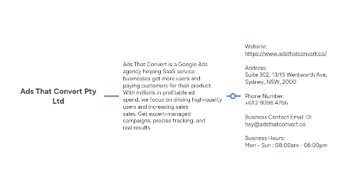 1.1. Website: https://www.adsthatconvert.co/ Address: Suite 302, 13/15 Wentworth Ave, Sydney, NSW, 2000 Phone Number: +61 2 9098 4766 Business Contact Email ID: hey@adsthatconvert.co Business Hours: Mon - Sun : 08:00am - 06:00pm