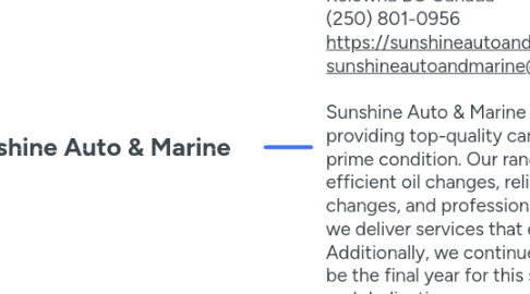 1. Kelowna BC Canada (250) 801-0956 https://sunshineautoandmarine.ca/ sunshineautoandmarine@gmail.com Sunshine Auto & Marine is marine servicing company, we specialize in providing top-quality care for your boats and vehicles to ensure they stay in prime condition. Our range of services includes expert boat polishing, efficient oil changes, reliable shrink wrapping, thorough detailing, battery changes, and professional acid washing. With a commitment to excellence, we deliver services that enhance both the functionality and appearance. Additionally, we continue to offer vehicle detailing services, although this may be the final year for this service. Trust us to handle your needs with precision and dedication.