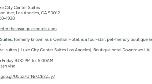 1. Downtown LA Luxe City Center Suites Adress: 223 S Grand Ave, Los Angeles, CA 90012 Phone no: 949-500-1938 Website: https://luxecitycenter.thelosangeleshotels.com About us: Luxe City Center Suites, formerly known as E Central Hotel, is a four-star, pet-friendly boutique hotel located in the heart of Downtown Los Angeles. Ideal for both business travelers and tourists, the hotel offers 178 guest rooms and suites with modern amenities such as flat-screen TVs, mini-bars, and complimentary Wi Fi World Rainbow Hotels+11Family Vacation Critic+11KAYAK+11. Guests can access on-site dining and a stylish bar/lounge area, enjoy the fitness center, and utilize event spaces spanning over 8,000 sq ft for meetings or social gatherings luxecitycenter.thelosangeleshotels.com. Located steps from the Crypto.com Arena and LA Live entertainment district, it provides guests with unbeatable proximity to major venues and attractions.https://luxecitycenter.thelosangeleshotels.com Related Searches: Downtown LA hotel suites | Luxe City Center Suites Los Angeles| Boutique hotel Downtown LA| Hotel near Crypto.com Arena | Hotel near LA Live| Pet friendly hotel Downtown LA | 24 hour front desk hotel LA | Hotels with gym Downtown Los Angeles |Conference venues Downtown LA |Event space near Staples Center |Hotel with bar/lounge LA |Rooms with mini bar and Wi Fi LA |Accessible hotel Downtown LA additional details Hours: Monday to Friday 9:00:PM to 5:00AM Payment: All cc ,cash visa GMB https://maps.app.goo.gl/U5bz7UfNiKCE2ZJy7
