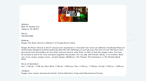 1. Address: 8501 W. Bowles Ave., Littleton, CO 80123 Phone: 720 608 9388 Website: Escape The Room Denver | Littleton's #1 Escape Room Game Escape the Room Denver is the #1 escape room experience in Colorado! Our rooms at Littleton's Southwest Plaza are meticulously designed real-life mystery puzzles that will challenge you and give you the time of your life! Each room has secrets and clues hidden all over them and you need to solve them in order to find the escape route. You have 60 minutes to search for clues and piece together the puzzles. You can play with friends, family, or co-workers. Book one of our unique escape rooms - Jurassic Escape, Meltdown, The Theater, The Submarine, or The Western Bank Heist. Hours of Operation: Sun: 11:00 am - 12:00 am, Mon-Wed: 11:00 am - 10:00 pm, Thur: 11:00 am - 11:00 pm, Fri-Sat: 11:00 am - 12:00 am Category: Escape room center, Amusement Center, Tourist Attraction, Corporate Entertainment Service