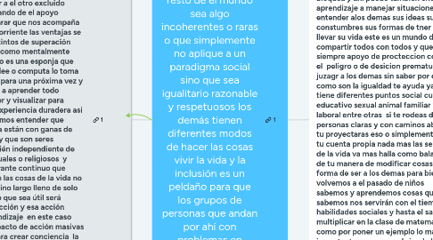 la inclusion un tema por debatir muchas cosas de que las personas el la sociedad tienen que tener oportunidades y que a pesar de sus limitaciones o pertenezcan a grupos que para el resto de el mundo sea algo incoherentes o raras o que simplemente no aplique a un paradigma social sino que sea igualitario razonable y respetuosos los demás tienen diferentes modos de hacer las cosas vivir la vida y la inclusión es un peldaño para que los grupos de personas que andan por ahí con problemas en desventaja económica o de igualdad sexual y hasta educativa se consagren también como parte igual en la comunidad que llamamos tierra eso es la inclusión para mi