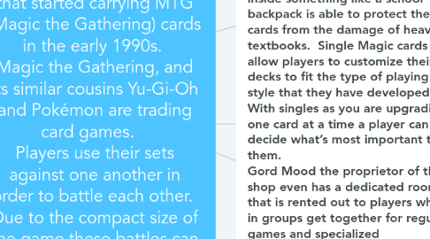 1. . Due to the competitive nature of the games players come by and buy either sealed packs of cards or for those looking to get an edge in their decks will buy single cards. Plastic deck boxes provide a hard protective case that when put inside something like a school backpack is able to protect the cards from the damage of heavy textbooks. Single Magic cards allow players to customize their decks to fit the type of playing style that they have developed. With singles as you are upgrading one card at a time a player can decide what’s most important to them. Gord Mood the proprietor of the shop even has a dedicated room that is rented out to players who in groups get together for regular games and specialized tournaments. Aside from the fun of battles the cards themselves feature artwork that by itself has developed a separate market of collectors who buy the cards for their artistic value. The cards are made of heavy stock paper or cardboard.