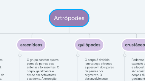 3.1. O grupo contém quatro pares de pernas e as antenas são ausentes. O corpo, geralmente é divido em cefalotórax e abdome. A excreção é pelas glândulas coxais ou pelos túbulos de Malpighi; o desenvolvimento é direto ou indireto e a respiração pode ser traqueal ou filotraqueal. Podemos citar como exemplo a aranha e o escorpião. O habitat mais comum do grupo é terrestre.