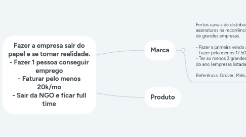 Fazer a empresa sair do papel e se tornar realidade. - Fazer 1 pessoa conseguir emprego - Faturar pelo menos 20k/mo - Sair da NGO e ficar full time
