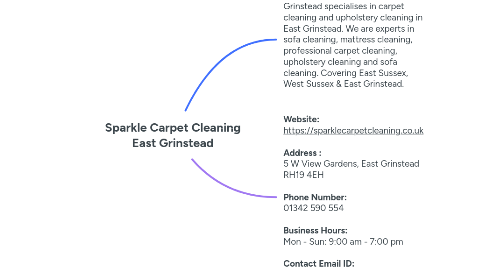 2. **Website:** https://sparklecarpetcleaning.co.uk **Address :** 5 W View Gardens, East Grinstead RH19 4EH **Phone Number:** 01342 590 554 **Business Hours:** Mon - Sun: 9:00 am - 7:00 pm **Contact Email ID:** info@sparklecarpetcleaning.co.uk