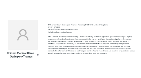 1. 1 Thames Court Goring on Thames Reading RG8 9AQ United Kingdom 01491 873989 https://www.chilternmedical.co.uk/ help@chilternmedical.co.uk The Chiltern Medical Clinic is run by Dr Niall Munnelly and his supportive group consisting of highly experienced medical aesthetic doctors, specialists, nurses and laser therapists. We have 2 centers, located in Goring-on-Thames and Reading that are both contemporary and friendly aesthetics centers. They provide a variety of advanced treatments that can only be offered by a registered doctor. All of our therapies are suitable for both males and females alike. We like what we do and we're positive that you will certainly like what we do also. We offer a complimentary no-obligation consultation for certain therapies so that you can be found in and meet us, ask lots of questions about your therapy choices, and figure out more regarding how we operate.