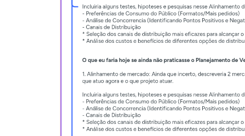 1.2. **O que eu faria hoje se ainda não praticasse o Planejamento de Vendas** 1. Alinhamento de mercado: Ainda que incerto, descreveria 2 mercados - o que atuo agora e o que projeto atuar. Incluiria alguns testes, hipoteses e pesquisas nesse Alinhamento de Mercado: - Preferências de Consumo do Público (Formatos/Mais pedidos) - Análise de Concorrencia (Identificando Pontos Positivos e Negativos) - Canais de Distribuição * Seleção dos canais de distribuição mais eficazes para alcançar o público-alvo. * Análise dos custos e benefícios de diferentes opções de distribuição.