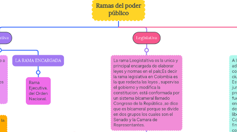 1.1.1. Conformada por el Congreso de la República , esta a su vez esta integrada por el Senado de la República y la Cámara de Representantes.La rama ejecutiva está compuesta por el Presidente, que es jefe de Estado, jefe de gobierno y máxima autoridad administrativa. También se compone de gobernaciones, alcaldías, superintendencias, establecimientos públicos y empresas industriales y comerciales de propiedad del Estado.