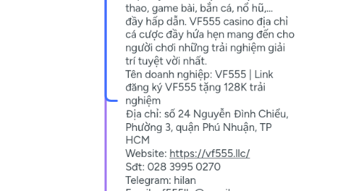 1. VF555 sòng bài trực tuyến cung cấp đầy đủ thể loại cá cược thể thao, game bài, bắn cá, nổ hũ,… đầy hấp dẫn. VF555 casino địa chỉ cá cược đầy hứa hẹn mang đến cho người chơi những trải nghiệm giải trí tuyệt vời nhất. Tên doanh nghiệp: VF555 | Link đăng ký VF555 tặng 128K trải nghiệm Địa chỉ: số 24 Nguyễn Đình Chiểu, Phường 3, quận Phú Nhuận, TP HCM Website: https://vf555.llc/ Sđt: 028 3995 0270 Telegram: hilan Email: vf555llc@gmail.com Tags: #vf555 #vf555casino #nhacaivf555 #vf555llc