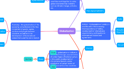 4. Politics - Globalization of politics is manifested in the increasing interdependence of states, development of international organizations, participation in international treaties and agreements.