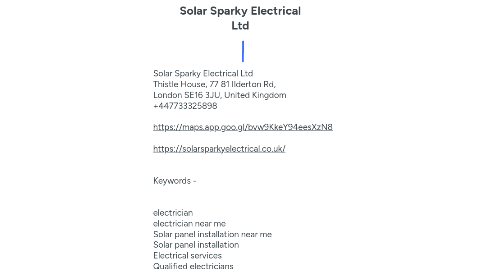 1. Solar Sparky Electrical Ltd Thistle House, 77 81 Ilderton Rd, London SE16 3JU, United Kingdom +447733325898 https://maps.app.goo.gl/bvw9KkeY94eesXzN8 https://solarsparkyelectrical.co.uk/ Keywords - electrician electrician near me Solar panel installation near me Solar panel installation Electrical services Qualified electricians Renewable energy services Residential solar panels Commercial solar solutions Electrical repairs Solar panel costs Electrical safety checks Solar installation near me Electric vehicle charging EV charger installation Off-grid solar systems Industrial electrical services Full-service electrician Electrical inspection Electrical contracting services Local solar companies Commercial electrical contractors Premium solar systems Residential solar energy systems Commercial solar panel systems Fuse Board Upgrade consumer unit installation EICR Solar panels London EV charger installation South London EICR services Peckham Electrician in South East London London commercial electrical services Residential solar solutions London Greenwich solar energy company Solar energy consultants Bromley Renewable energy Southwark Surrey Quays electrician services