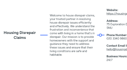1.1. **Website:** https://housingdisrepairclaims.info **Address:** 75 Exploration Drive, Leicester, LE4 5NU **Phone Number:** 020 3340 9860 **Contact Email ID:** hello@housingdisrepairclaims.info **Business Hours:** 24/7