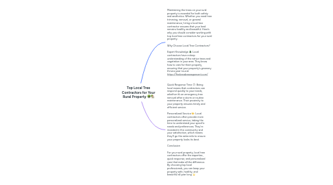2. Quick Response Time ⏱️: Being local means that contractors can respond quickly to your needs, whether it’s an emergency tree removal after a storm or routine maintenance. Their proximity to your property ensures timely and efficient service. Personalized Service 🤝: Local contractors often provide more personalized service, taking the time to understand your specific needs and preferences. They’re invested in the community and your satisfaction, which means they’ll go the extra mile to ensure your property looks its best. Conclusion For your rural property, local tree contractors offer the expertise, quick response, and personalized care that make all the difference. By choosing top local professionals, you can keep your property safe, healthy, and beautiful all year long. 🌟