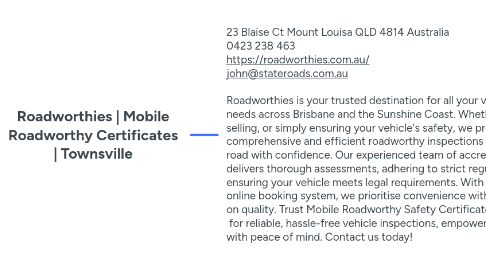 1. 23 Blaise Ct Mount Louisa QLD 4814 Australia 0423 238 463 https://roadworthies.com.au/ john@stateroads.com.au Roadworthies is your trusted destination for all your vehicle inspection needs across Brisbane and the Sunshine Coast. Whether you're buying, selling, or simply ensuring your vehicle's safety, we provide comprehensive and efficient roadworthy inspections to keep you on the road with confidence. Our experienced team of accredited inspectors delivers thorough assessments, adhering to strict regulatory standards, ensuring your vehicle meets legal requirements. With a user-friendly online booking system, we prioritise convenience without compromising on quality. Trust Mobile Roadworthy Safety Certificates | Roadworthies for reliable, hassle-free vehicle inspections, empowering you to drive with peace of mind. Contact us today!