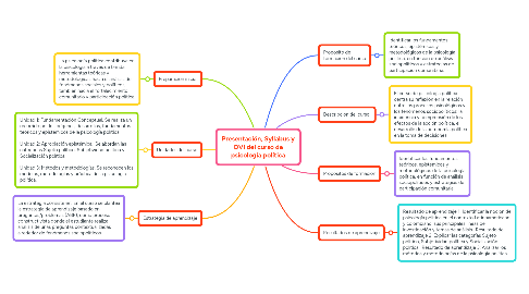 2.1. Unidad 1: Fundamentación Conceptual. Se realiza un recorrido por los orígenes, desarrollos, fundamentos teóricos y epistémicos de la psicología política. Unidad 2: Apropiación epistémica. Se abordan las categorías Sujeto político, Subjetividad política y Socialización política. Unidad 3: Métodos y metodologías. Se reconocen los modelos, metodologías y práctica de la psicología política.