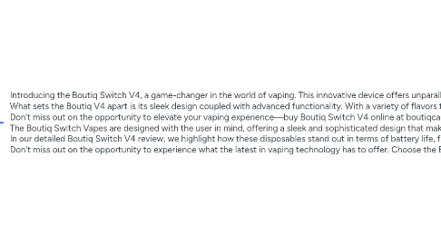 1. Introducing the Boutiq Switch V4, a game-changer in the world of vaping. This innovative device offers unparalleled convenience and performance, making it the go-to choice for both seasoned vapers and newcomers alike. The Boutiq V4 disposable vape is designed with user experience in mind, providing a seamless and satisfying experience every time. What sets the Boutiq V4 apart is its sleek design coupled with advanced functionality. With a variety of flavors to choose from, you can customize your vaping experience to suit your preferences perfectly. Whether you're looking for something fruity or a classic tobacco flavor, the options are endless! Don’t miss out on the opportunity to elevate your vaping experience—buy Boutiq Switch V4 online at boutiqcart.com today! With just a few clicks, you can have this top-of-the-line product delivered right to your door. Experience the difference that quality makes with the Boutiq Switch V4 Vape look no further than the Boutiq Switch V4 Disposable. This product from the renowned Boutiq brand is not just another disposable vape; it's a game changer that elevates your vaping experience to new heights. The Boutiq Switch Vapes are designed with the user in mind, offering a sleek and sophisticated design that makes them both stylish and functional. The Boutiq V4 takes this a step further by incorporating advanced technology into its cartridges (Boutiq V4 Carts), ensuring you enjoy rich flavors and smooth draws every time. In our detailed Boutiq Switch V4 review, we highlight how these disposables stand out in terms of battery life, flavor variety, and ease of use. Whether you're a seasoned vaper or just starting out, the Boutiq Switch products offer something for everyone with their diverse range of flavors tailored to satisfy any palate. Don't miss out on the opportunity to experience what the latest in vaping technology has to offer. Choose the Boutiq Switch V4 Disposable for an unrivaled vaping journey that's as enjoyable as it is convenient