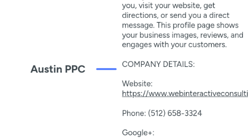 Get in the Top 3 of Google Local Maps From your GBP, a customer can call you, visit your website, get directions, or send you a direct message. This profile page shows your business images, reviews, and engages with your customers. COMPANY DETAILS: Website: https://www.webinteractiveconsulting.com/getnewcustomers Phone: (512) 658-3324 Google+: https://www.google.com/maps?cid=16728002303155501330 Address: 2025 Guadalupe St #260, Austin, TX 78705