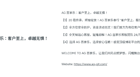 1. AG 百家乐:客户至上,卓越无惧! 【1】20 载传承,辉煌绽放!AG 百家乐奉行 “客户至上、服务第一” 原则,凭借卓越运营理念和专业服务,成为业内口碑犹佳的顶级博彩平台。我们的坚持和用心,赢得无数客户的信任和支持。 【2】全方位安全防护,资金流动无忧!我们致力为每位客户提供全面账户安全保障,从数据加密到资金管理,层层护航。大额资金快速出入款,确保资金安全畅通,让您体验无缝交易乐趣。 【3】全天候贴心客服,疑难即解!AG 百家乐客服团队 24/7 全年无休,随时倾听您的需求,解答疑惑。资金管理问题,我们郑重承诺,助您畅享安全透明的交易环境。 【4】选择 AG 百家乐,选择安心信赖!感受顶级博彩平台的刺激乐趣,享受尊贵安心服务体验。让 AG 百家乐成为您信任的伙伴,开启无忧畅快娱乐之旅! WELCOME TO AG 百家乐,让我们共同点燃梦想,闪耀舞台! Website: https://www.ag-qjt.com/