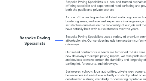 1. 72 Seaforth Road Harehills Leeds LS9 6AJ UK 0800 046 7254 https://www.bespokepavingspecialists.co.uk/ info@bespokepavingspecialists.co.uk Bespoke Paving Specialists is a local and trusted asphalt and Tarmac contractor, offering specialist and experienced road surfacing and paving services throughout both the public and private sectors. As one of the leading and established surfacing contractors in Leeds and the bordering areas, we have vast experience in a large range of paving jobs and satisfaction ourselves on the top quality of our job and the durable relationships we have actually built with our customers over the years. Bespoke Paving Specialists uses a variety of premium services in Leeds at an affordable rate. Our services include tarmacadam surfacing, block paving, and driveways. Our skilled contractors in Leeds are furnished to take care of numerous tasks. From new driveways to simple paving repairs, we take pride in using high-grade materials and devices to make certain the durability and longevity of your private roads, parking lot, forecourts, and driveways. Businesses, schools, local authorities, private road owners, and residential homeowners in Leeds have actually constantly relied on our services. We have constructed a strong credibility for delivering reputable and ensured results in Leeds and its surrounding areas. Whether you need tarmac repairs, road surfacing, pothole repairs, or the installment of block paved or resin driveways, Bespoke Paving Specialists is your relied on selection in Leeds.