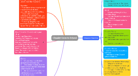 3. Main Character: Chuskit, a nine-year old girl Supporting Characters: Grandfather (Meme-ley), Abdul, School Headmaster Problem: Chuskit cannot go to school because her legs are paralyzed. The road is rough, and there is a stream without bridge. Goal: She wants to go to school like other children.