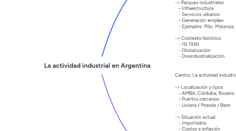 2. Centro: La actividad industrial en Argentina -> Localización y tipos - AMBA, Córdoba, Rosario - Puertos cercanos - Liviana / Pesada / Base -> Situación actual - Importados - Costos e inflación - Subsidios - Mercado interno -> Industria y contaminación - Residuos y emisiones - Uso del agua - Legislación ambiental - Tecnología limpia -> Parques industriales - Infraestructura - Servicios urbanos - Generación empleo - Ejemplos: Pilar, Matanza, Mar del Plata -> Contexto histórico - ISI 1930 - Globalización - Desindustrialización