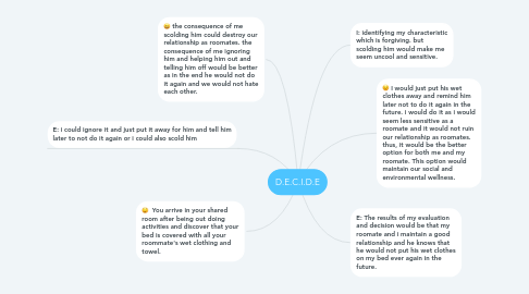 6. E: The results of my evaluation and decision would be that my roomate and i maintain a good relationship and he knows that he would not put his wet clothes on my bed ever again in the future.