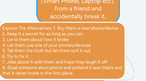 4. Consider The Consequences: For #1: They are very grateful that you bought them a new phone and forgive you For #1: They are glad you bought them a new phone but are still mad that you broke their old one. For #1: Your parents get mad that you have to pay for their new phone. For #1: Your parents are happy for you taking responsibility. For #2: Your friend never finds out and buys a new phone himself thinking he/she lost it. For #2: Your friend finds out, is furious, and stops hanging out with you. Your parents also ground you. For #3: They take the bait and live without ever knowing it was you who broke it. For #3: They find out that you lied to them and are extremely mad, and stop being your friend. Your parents ground you. For #4: They are very grateful for your support and like you even more as a friend. Your parents love your actions and support them. For #4: They think it’s cool that you’re giving them yours for a while but are still extremely mad and may never forgive you. For #4: They stop talking to you altogether and don’t take your offer. You get in trouble with your parents. For #5: They are grateful for your honesty, your parents are too, and are proud of you. For #5: They are grateful for your honesty, but still are mad because they think you should pitch in for what you’ve done. Your parents aren’t too impressed either. For #6: You never get to fixing it and your friend and parents find out and are very disappointed in you. For #6: You end up fixing it but do it very poorly, making it obvious you broke it, and getting in more trouble. For #7: They take it well and laugh it off with you. Your parents never find out. For #7: They don’t buy it, and are uber mad because you thought they’d shrug it off. They stop hanging out with you and your parents ground you. For #8: No one finds out and life goes on without anyone knowing what you did. For #8: Your friend, parents, and person you stole the phone from find out, and you realize that you are doomed for the rest of eternity.