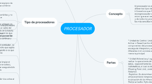5.1. * Unidad de Control: Unidad encargada de Activar o Desactivar los diferentes componentes del procesador, igualmente se encarga de Interpretar y ejecutar las diferentes instrucciones almacenadas en la memoria principal. * Unidad Aritmetica y Logica: Se encarga de realizar la operaciones de transformacion de datos, especialmente las operaciones matematicas, el cual es denocminado FPU (Floating Point Unit, Unidad de coma Flotante). * Registros: Se denominan a las areas de almacenamiento temporal usuadas durante la ejecucion de las intrucciones. * Memoria Cache: Parte donde se almacenan los datos con mas frecuente.
