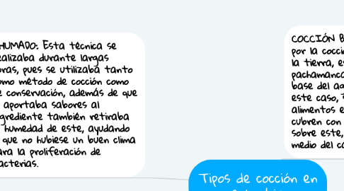 1. AHUMADO: Esta técnica se realizaba durante largas horas, pues se utilizaba tanto como método de cocción como de conservación, además de que le aportaba sabores al ingrediente también retiraba la humedad de este, ayudando a que no hubiese un buen clima para la proliferación de bacterias.