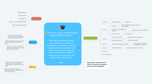 MASTER CLASS: 5 BASES PARA LIBERARSE DEL TABACO. Aprende los primeros pasos esenciales de un programa terapéutico completo con el que podrás empezar a ayudar a tus clientes/pacientes a dejar de fumar de forma permanente y disfrutar de una vida sana sin adicciones ni esclavitud. 49€