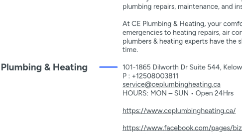 1. The professional plumbers at CE Plumbing & Heating of Kelowna are focused on delivering exceptional plumbing services paired with world-class customer support. We believe that courtesy service is one of the most important tools in our belt, allowing us to provide better plumbing repairs, maintenance, and installations to our clients. At CE Plumbing & Heating, your comfort is our number one priority. From plumbing emergencies to heating repairs, air conditioning installations and more, our professional plumbers & heating experts have the skills and expertise to get the job done right – the first time. 101-1865 Dilworth Dr Suite 544, Kelowna, BC V1Y 9T1, Canada P : +12508003811 service@ceplumbingheating.ca HOURS: MON – SUN • Open 24Hrs https://www.ceplumbingheating.ca/ https://www.facebook.com/pages/biz/west-kelowna/CE-Plumbing-Heating-221183278657710/ https://www.instagram.com/ceplumbingheating/ https://www.linkedin.com/company/ce-plumbing-heating/about/ https://www.yelp.com/biz/ce-plumbing-and-heating-west-kelowna?osq=ce+plumbing
