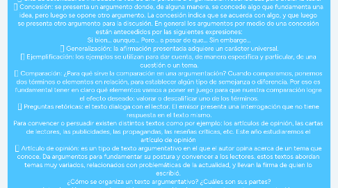 ¿Qué recursos se pueden utilizar para convencer a los lectores? Se fundamenta una posición u opinión con más precisión y legitimidad si se presentan distintas expresiones que dan mayor fuerza a la argumentación. Cita de autoridad: se introduce la voz de una persona u organización reconocidas para avalar la tesis. Concesión: se presenta un argumento donde, de alguna manera, se concede algo que fundamenta una idea, pero luego se opone otro argumento. La concesión indica que se acuerda con algo, y que luego se presenta otro argumento para la discusión. En general los argumentos por medio de una concesión están antecedidos por las siguientes expresiones: Si bien… aunque... Pero… a pesar de que… Sin embargo… Generalización: la afirmación presentada adquiere un carácter universal. Ejemplificación: los ejemplos se utilizan para dar cuenta, de manera específica y particular, de una cuestión o un tema. Comparación: ¿Para qué sirve la comparación en una argumentación? Cuando comparamos, ponemos dos términos o elementos en relación, para establecer algún tipo de semejanza o diferencia. Por eso es fundamental tener en claro qué elementos vamos a poner en juego para que nuestra comparación logre el efecto deseado: valorar o descalificar uno de los términos. Preguntas retóricas: el texto dialoga con el lector. El emisor presenta una interrogación que no tiene respuesta en el texto mismo. Para convencer o persuadir existen distintos textos como por ejemplo: los artículos de opinión, las cartas de lectores, las publicidades, las propagandas, las reseñas críticas, etc. Este año estudiaremos el artículo de opinión Artículo de opinión: es un tipo de texto argumentativo en el que el autor opina acerca de un tema que conoce. Da argumentos para fundamentar su postura y convencer a los lectores. estos textos abordan temas muy variados, relacionados con problemáticas de la actualidad, y llevan la firma de quien lo escribió. ¿Cómo se organiza un texto argumentativo? ¿Cuáles son sus partes? Introducción o punto de partida: presenta el hecho que da origen a la argumentación. Tesis: expresa explícita o implícitamente la idea u opinión del emisor. Demostración o desarrollo argumentativo: presenta las razones que conducirán a la aceptación de la tesis para lo cual se usan diversas estrategias argumentativas.