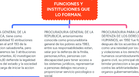 1. FISCALIA GENERAL DE LA REPUBLICA, tiene como responsabilidad 10 atribuciones descrita en el art# 193 de la constitucion salvadoreña, pero mencionaremos las 3 atribuciones mas importantes, A) investigacion de delitos,B) defiende la legalidad intereses del estado y la sociedad C) se encarga de iniciar la accion penal.