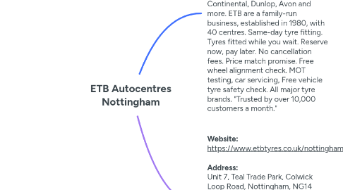 1. ETB Autocentres in Nottingham is your local tyre provider in Nottingham. All our tyres are supplied and fitted by experts and we can offer same day fitting. We stock all of the major tyre manufacturers including Bridgestone, Firestone, Michelin, Goodyear, Landsail, Pirelli, Continental, Dunlop, Avon and more. ETB are a family-run business, established in 1980, with 40 centres. Same-day tyre fitting. Tyres fitted while you wait. Reserve now, pay later. No cancellation fees. Price match promise. Free wheel alignment check. MOT testing, car servicing, Free vehicle tyre safety check. All major tyre brands. "Trusted by over 10,000 customers a month."