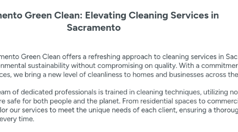 1. Sacramento Green Clean offers a refreshing approach to cleaning services in Sacramento, prioritizing environmental sustainability without compromising on quality. With a commitment to green practices, we bring a new level of cleanliness to homes and businesses across the city. Our team of dedicated professionals is trained in cleaning techniques, utilizing non-toxic products that are safe for both people and the planet. From residential spaces to commercial establishments, we tailor our services to meet the unique needs of each client, ensuring a thorough and efficient clean every time. At Sacramento Green Clean, we understand the importance of a healthy living and working environment. That's why we go the extra mile to minimize our carbon footprint while maximizing the cleanliness of your space. Whether you're looking for regular maintenance or a one-time deep clean, you can trust us to deliver exceptional results with a focus on sustainability. Join us in our mission to create a greener, cleaner Sacramento. Experience the difference with Sacramento Green Clean today. visit: https://sacramentogreenclean.com/