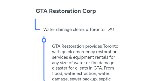 1.1. GTA Restoration provides Toronto with quick emergency restoration services & equipment rentals for any size of water or fire damage disaster for clients in GTA. From flood, water extraction, water damage, sewer backup, septic backup, mold remediation, fire, storm damage, wet basements' insurance claims, insurance adjusters & expert consultation, we offer you and your business a quick response to any size loss at any time.