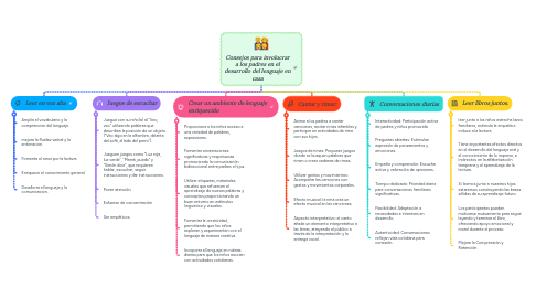El mapa conceptual ofrece consejos clave para padres sobre cómo fomentar el desarrollo del lenguaje en el hogar. Incluye ideas sobre lectura compartida, conversaciones significativas, juegos interactivos y el uso de recursos como libros y actividades creativas para estimular el lenguaje en los niños.
