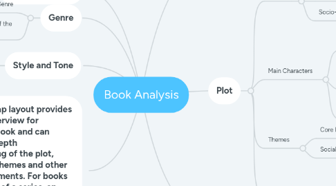 4. This mind map layout provides a general overview for analysing a book and can assist in in-depth understanding of the plot, characters, themes and other essential elements. For books that are part of a series, an additional sub-topic can be added to discuss the series as a whole and the book's place within it.