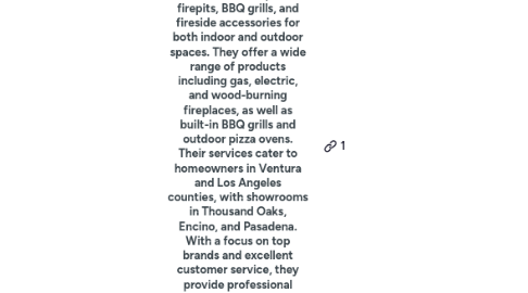Thousand Oaks Fireside, fireplace store specializes in high-quality, customizable fireplaces, firepits, BBQ grills, and fireside accessories for both indoor and outdoor spaces. They offer a wide range of products including gas, electric, and wood-burning fireplaces, as well as built-in BBQ grills and outdoor pizza ovens. Their services cater to homeowners in Ventura and Los Angeles counties, with showrooms in Thousand Oaks, Encino, and Pasadena. With a focus on top brands and excellent customer service, they provide professional consultation, installation, and maintenance to enhance the comfort and style of any home.