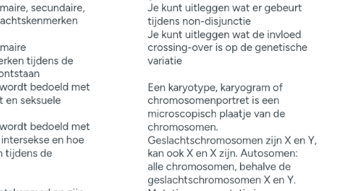5.1. 4 Vwo Nectar Erfelijkheid 2 Chromosomen en mutaties Leerdoelen Je weet wat een karyotype is Je weet wat het verschil is tussen autosomen en chromosomen Je kunt uitleggen wat een mutatie is Je kunt voorbeelden noemen van puntmutaties Je kunt voorbeelden noemen van chromosoommutaties Je kunt voorbeelden noemen van genoommutaties Je kunt uitleggen wat er gebeurt tijdens non-disjunctie Je kunt uitleggen wat de invloed crossing-over is op de genetische variatie Een karyotype, karyogram of chromosomenportret is een microscopisch plaatje van de chromosomen. Geslachtschromosomen zijn X en Y, kan ook X en X zijn. Autosomen: alle chromosomen, behalve de geslachtschromosomen X en Y. Mutaties: een mutatie is een spontane verandering in het erfelijk materiaal. Er zijn drie verschillende mutaties: Puntmutaties, chromosoommutaties, en genoommutaties. Puntmutatie: een hele kleine mutatie in het DNA, echt op nucleotide niveau. Bij deletie wordt er een nucleotide verwijderd, waardoor de hele boel 1 plekje opschuift. Kan gevolgen hebben voor een organisme, kan soms ook geen gevolgen hebben. Insertie is wanneer er een nucleotide wordt toegevoegd. Bij Substitutie wordt er een nucleotide vervangen voor een ander. Chromosoommutatie: bij chromosoommutatie heeft de mutatie betrekking op een groter gebied van de chromosoom. Bij deletie wordt een stuk van de chromosoom verwijdert, bij duplicatie wordt een deel aan de chromosoom toegevoegd, bij inversie is op 1 van de 2 chromosomen een klein stuk omgedraaid, bij translocatie wordt een DNA segment van de ene chromosoom naar een ander (niet homoloog) chromosoom verplaatst. Genoommutaties: bij genoommutaties wordt het aantal chromosomen van een organisme veranderd. De meest bekende is trisomie 21: het syndroom van down. Genoommutaties worden veroorzaakt door non-disjuncties tijdens meiose 1 of meiose 2. Crossing over: tijdens crossing over worden er delen van de chromatiden van de homologe chromosomen uitgewisseld. Dit gebeurd tijdens meiose 1. Door crossing over is er meer genetische variatie. Je hebt een chromosomenpaar, tijdens meiose 1 gaan die naast elkaar liggen en soort van 'voetjes' uitwisselen.
